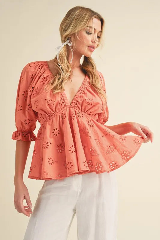 Aemi + Co Eyelet Embroidered V-Neck Half Sleeve Peplum Blouse