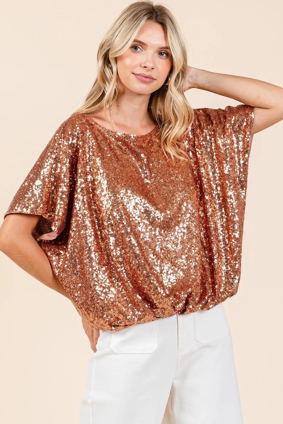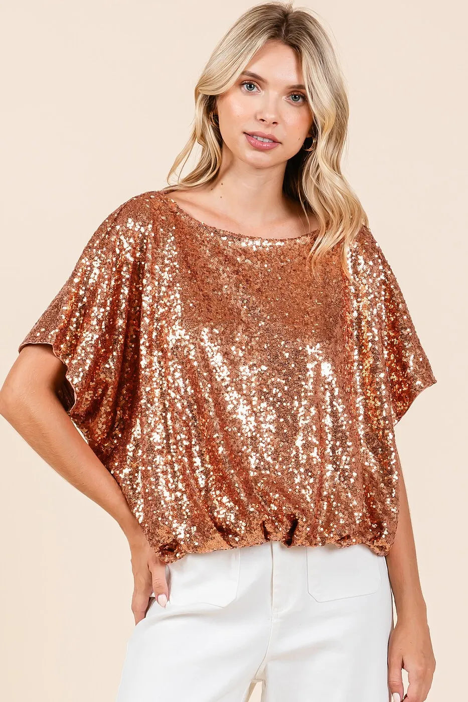 This short sleeve top features eye-catching sequins all over, perfect for adding some sparkle to your outfit. The elastic band hem provides a fitted and flattering silhouette. Ideal for special occasions or adding a touch of glamour to your everyday look. Shine bright in this sequin top with a stylish elastic band hem!